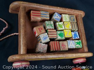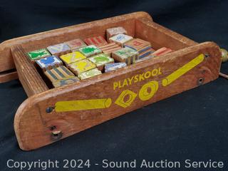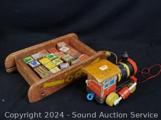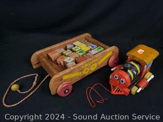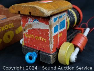 Various wear from age, use. Fisher Price Huffy Puffy wood train, wood blocks, drumming monkey, dolls, etc. Refer to photos for more details.