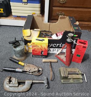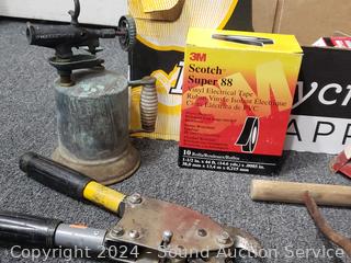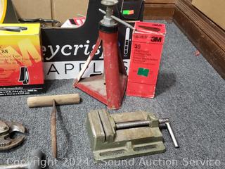 Starter solenoids, jack stand, vinyl plastic electrical tape, crown staples, torch, machinist vise, crimping tool, pipe cutter & more.