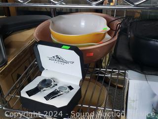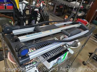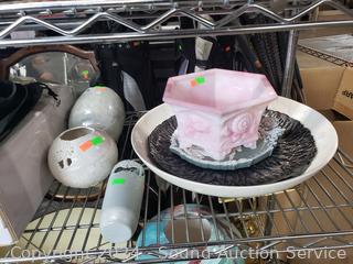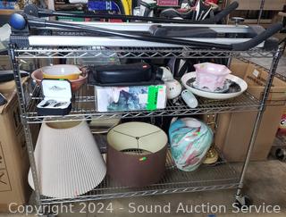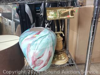One-on-One Trainer (grips damaged, knobs tighten handles are broken, still works), Muckleshoot Casino Quartz watches, hand painted pottery vase, lamp shades, jasper ware cameo plaque, 3 handcrafted pottery vases, pink glass pot & more. Cart NOT included. ATTN: All items are used, may be missing pieces, damaged, not functioning, complete, no issues, etc. All items as is. Refer to photos for more details.
