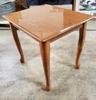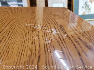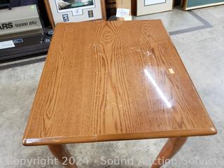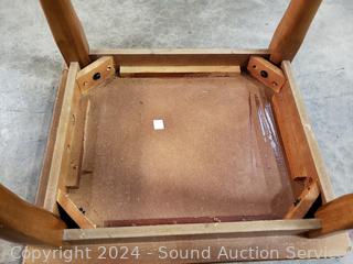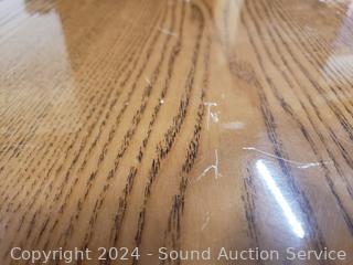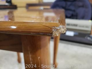 Wood gran finish, one corner has some damage. Some scuffs, scratches in the top. 20" H x 18" W x 21" D.