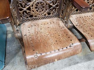 Ornate cast iron frame, velvet backs, bent wood seats. Folds up for storage. Numbered 40, 41, 125. 39" H x 57" L x 18" to seat.