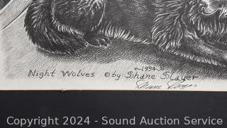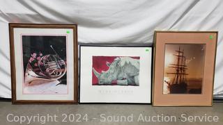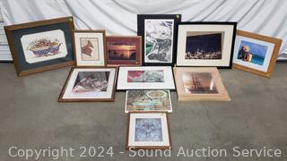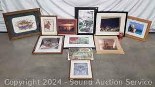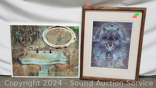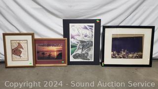 Wolf Print, 12" x 15". Shane Slayer signed 1994 "Night Wolves" Drawing, 16" x 20". Artistique Falour Plaque, 14.5" x 11.5". Sunset Photo, 12" x 15". "The French Horn" Print, 12"x 14.5". Beach Photo, 17" x 14". Night City Scape Photo, 17.5" x 21.5". Robert bugle signed French Horn Photo, 22" x 18". William Bullas "Wine-Oceras" Gallery Print, 16.5" x 20.5". la Rogue Signed Ship Sunset Photo, 22.5" x 16.5". M.Simandle Signed Fruit Still Life Watercolor Painting, 19" x 23".