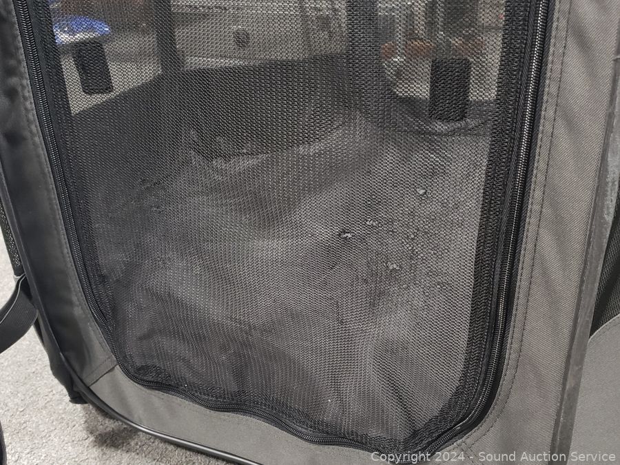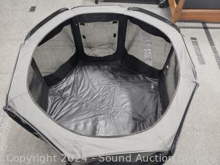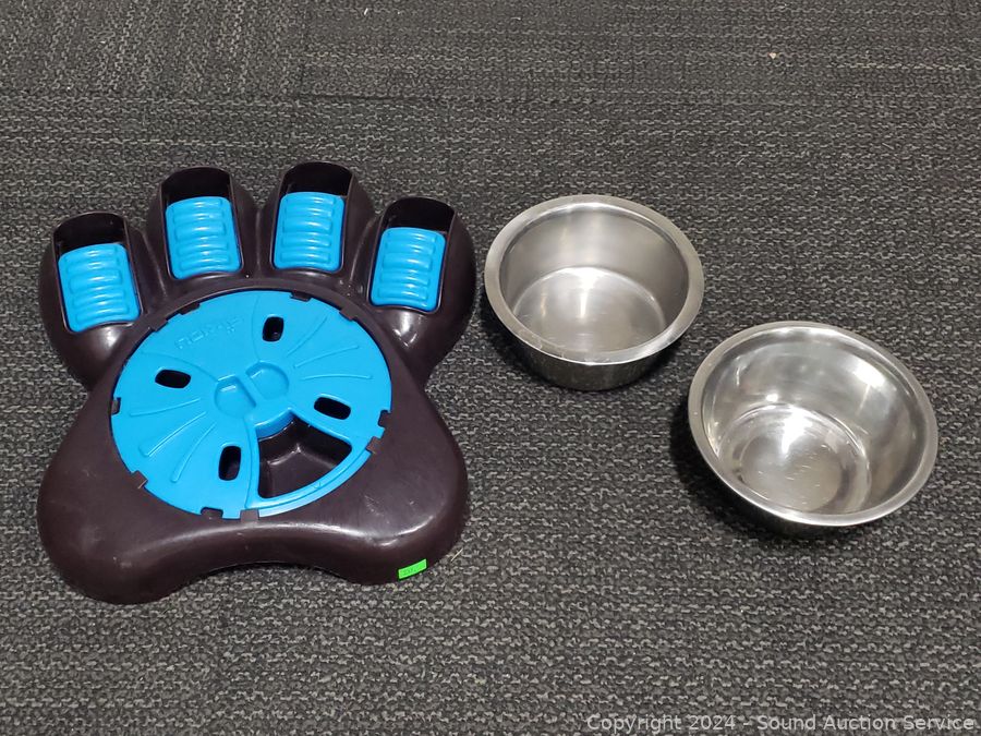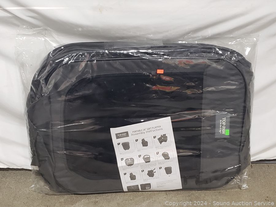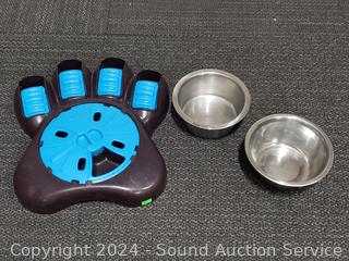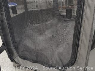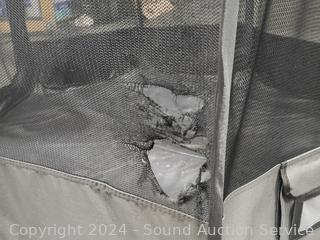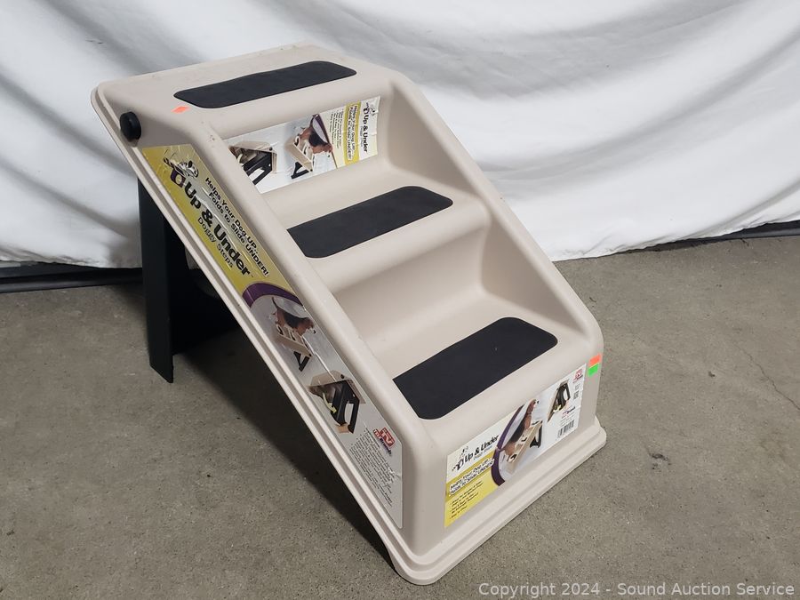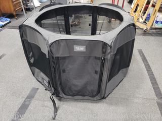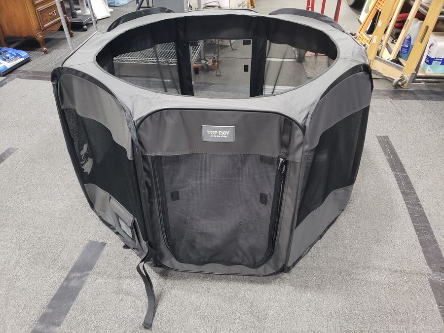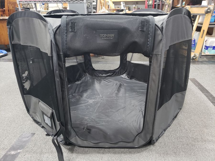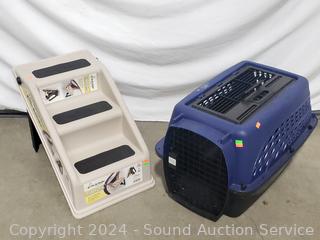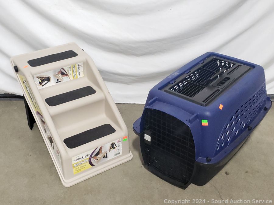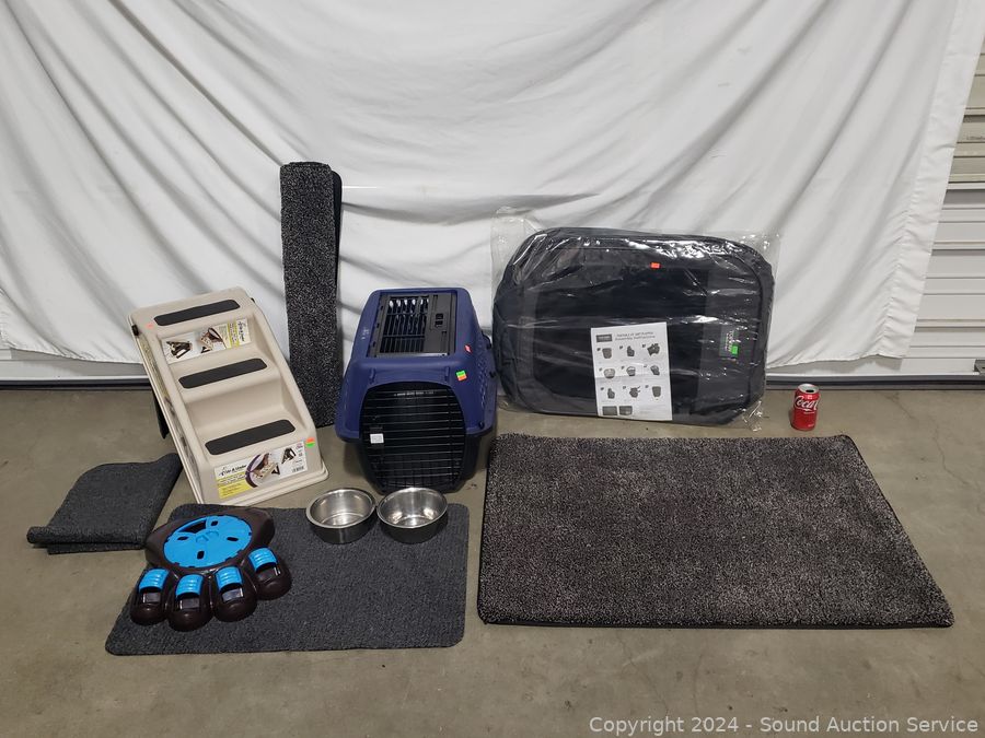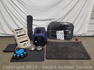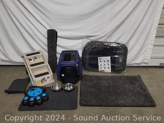Pet Step (70LB 14.5" H x 12" W x 21" L), Pet Mats (1) 38" x 29", (2) 30" x 19", 2 Stainless Feed Bowls, Small Pet Kennel 15" H x 15" x 23", Puzzle Treat Dish, Top-Paw Portable 28" Soft Playpen (has some pet damage to the sides, holes).
