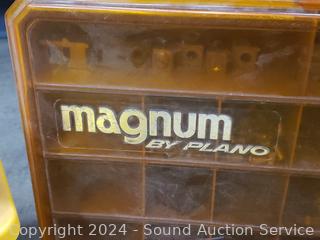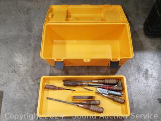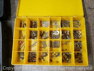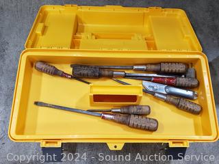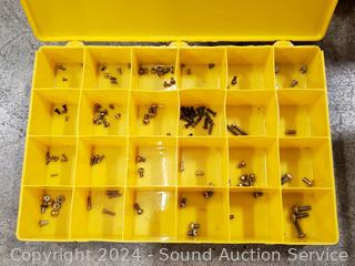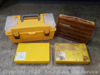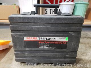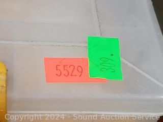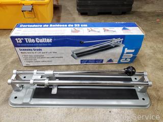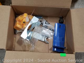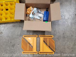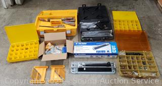 13" Tile Cutter, Some sort of jig?, Yellow 20" Toolbox w/Some Nuts, Screwdrivers, Miter Saw Accessories Kit, 3 Hardware Organizers w/Hardware. Refer to photos for more details.