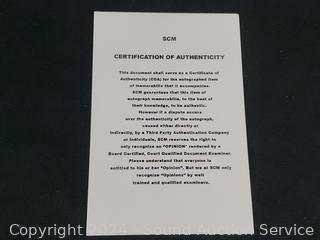 One frame corner has come loose held together by tape. Unable to authenticate, does come with a CoA from "Signed Certified Memories". ATTN: We are not sports/trading card, memorabilia experts or graders, please use your own judgement when bidding.