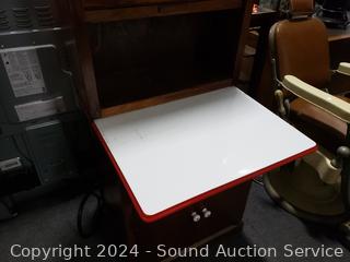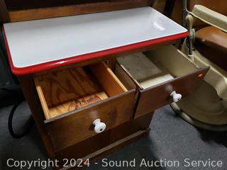 Enameled steel pullout tabletop, tambour door (hard to open close), toe kick board has come free. Approx. 69" H x 27.5" W x 11" to 22" D. Various wear from age, use. Wood construction, porcelain knops, steel top.