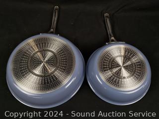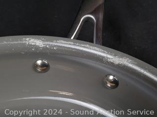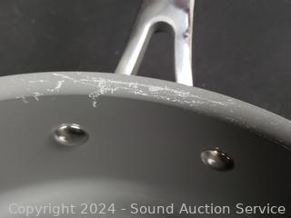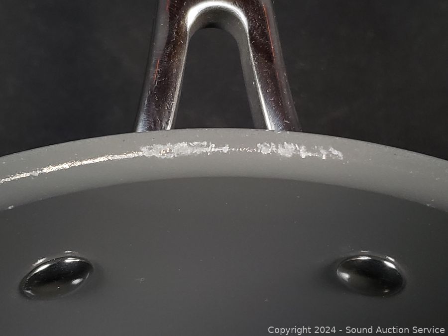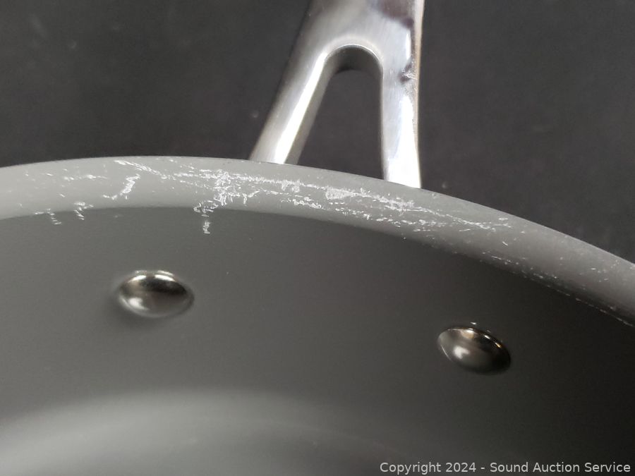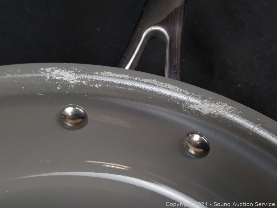 Some scuffs, mostly on edges, otherwise appear unused. 3 & 4qt? Saucepans, (2) 10" Skillets, (1) 12" Skillet, 8qt Boiling Pot. Refer to photos for more details.