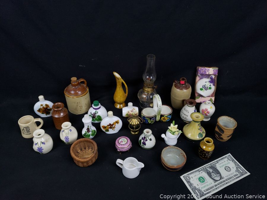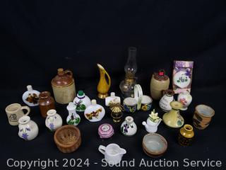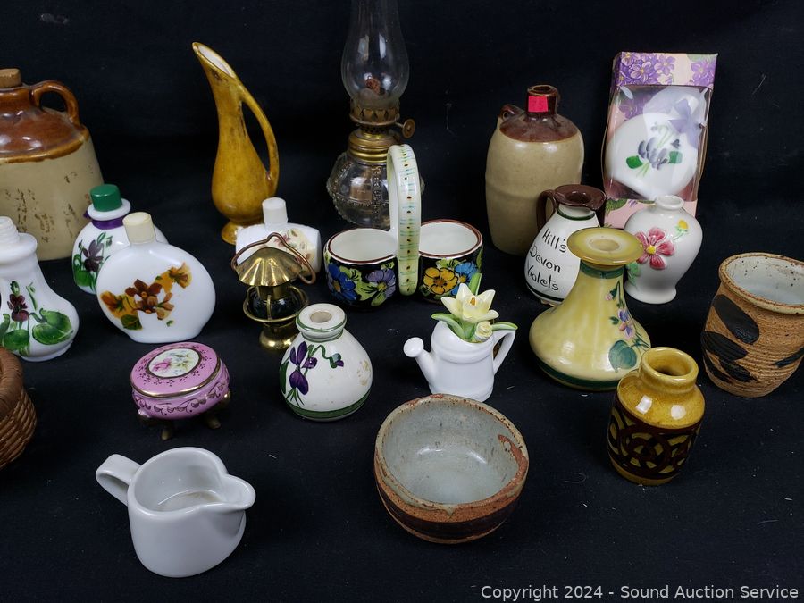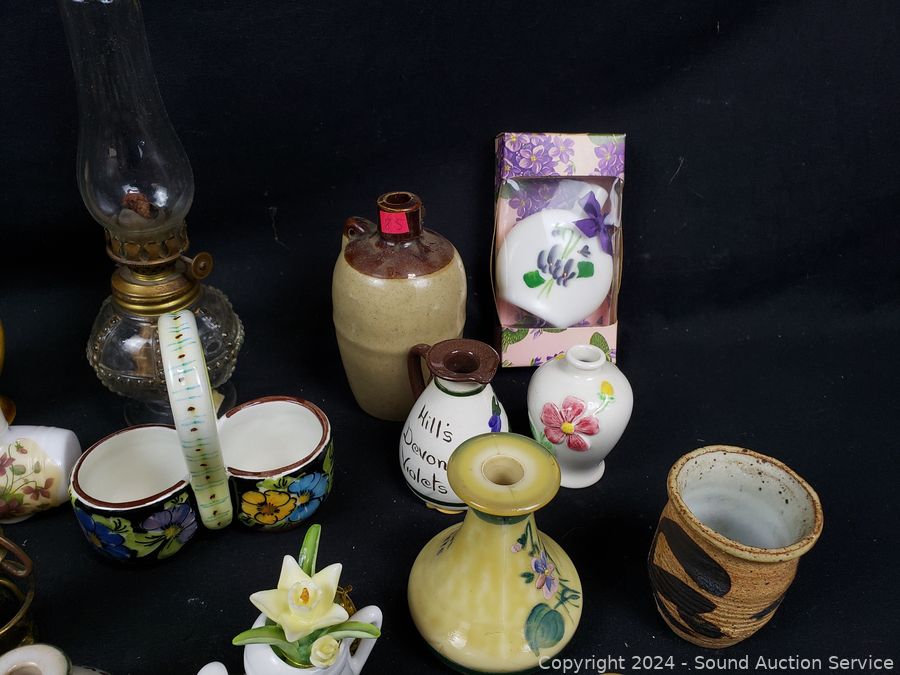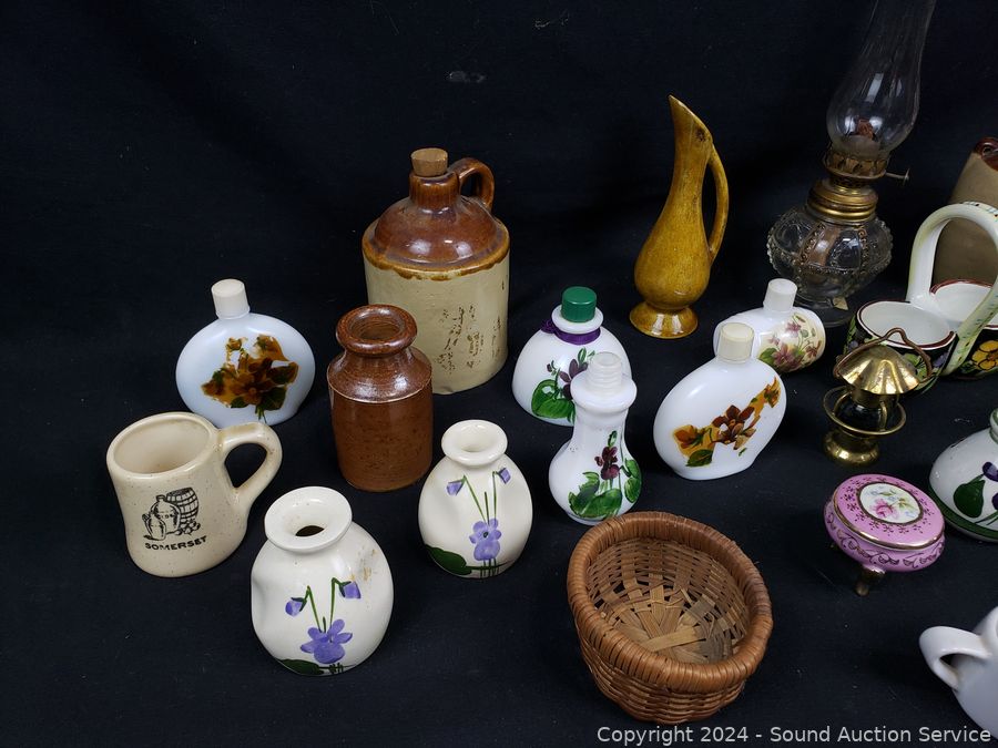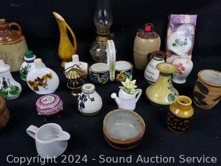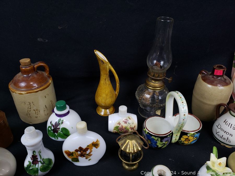 Lot #0211: Assorted Bottles, Bars, Jugs, Oil Lamp