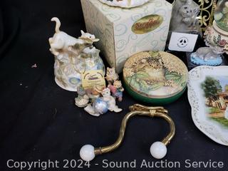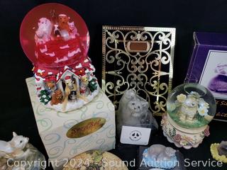 Crystal & Silverplate Triple Server, Germany Porcelain Vase, Photo Album, Quarry Critter Figure, Snowglobes, Cat Figures, Collectors Plate & More. 11" x 16" x 22" tote with lid. Refer to photos for more details.