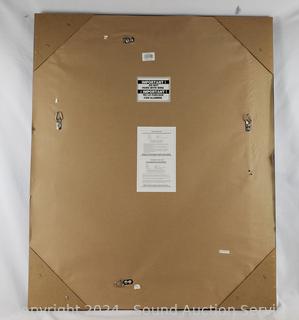 "D" Rings for vertical or horizontal hang. 29" x 35". Don't see any issues.