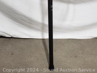 Fits approx. 78" to 90". Bottom shelf has broken clip/support. Signs of wear from use.