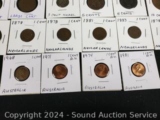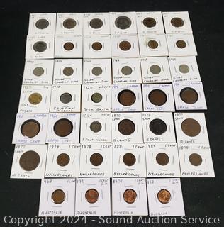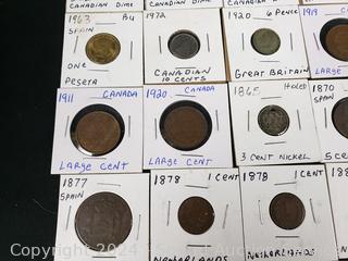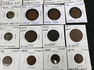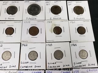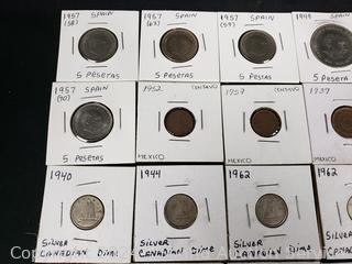 (4) 1878-80's Netherlands 1c, (2) 1870-78 Spain 5c, (2) 1877 Spain 10c, 1865 Holed 3c Nickel, (5) 1911-20 Canada Large Cents, 1920 Great Britain 6 Pence, 1972 Canada 10c, 1963 Spain 1c, 96) 1940-1965 Silver Canadian Dimes, (5) 1939-64 Mexico Centavos, (7) 1949-57 Spain 5 Pesetas, (4) 1968-81 Australia 1c. ATTN: We are not coin or currency experts or graders, please use your own judgement when bidding.