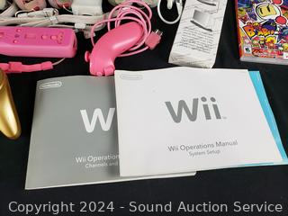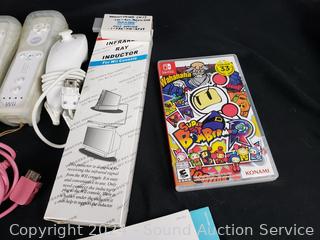 Super Bomberman Nintendo Switch Game (Awesome game!). Wii comes with manual, 7 controllers, 2 nunchucks, sensor bar, power supply. Has power, otherwise untested.