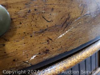 Mirror has some cracks, brass railing for the top, brass & porcelain pulls. 30" to 56" H x 47" W x 21" D. Some scuffs, wear to finish.