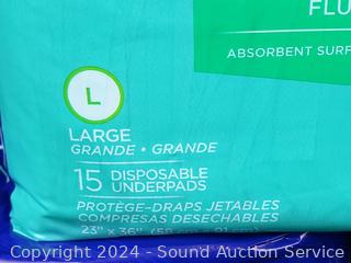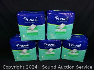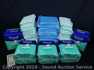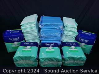 (5) 15pk Prevail 23" x 36" Pads, factory sealed. (5) 15pk of other Absorbent Pads, factory sealed, unmarked & assorted loose pads. Refer to photos for more details.