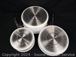9", 10", 11" skillets/frypan, 3qt? saucepan 8qt? boiling pot. Induction ready. In great condition.