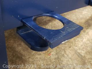 Various weathering wear, scuffs, gouge in one arm rest, see one slat in back rest that is split, cup holders built into armrests. Approx. 34" H x 30" W x 13.5" to seat. Refer to photos for more details.