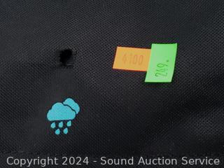 Approx. 25" x 13" x 12". Missing a clip on the bottom pouch, small hole in the bottom, otherwise good condition.
