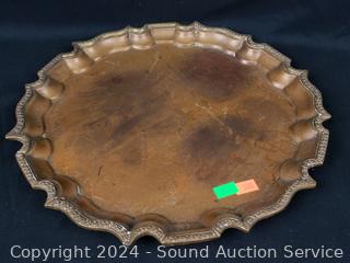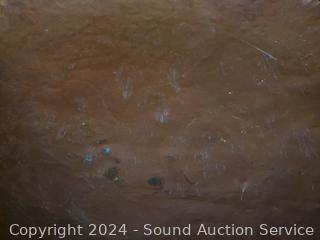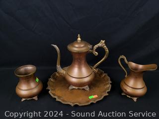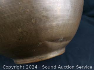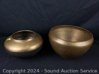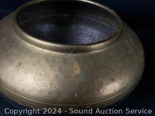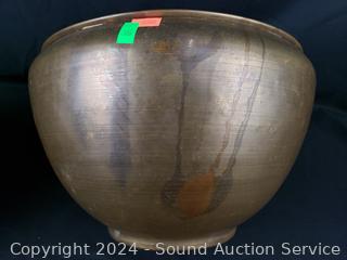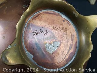 9.5" Dia. hammered brass pot, 7" H x 12" Dia. pot, 18" Dia. copper dish, 4pc Kathy Bartley signed vase, pitcher, tea/coffee pot, 12" tray. Various dings, dents, tarnish. Refer to photos for more details.