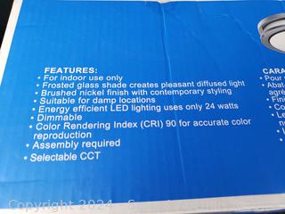 Brushed metal finish, frosted glass lens, integrated LED's, 24W, 1560LM, 3000-500K color. Appears to be functioning as intended, don't see any issues.