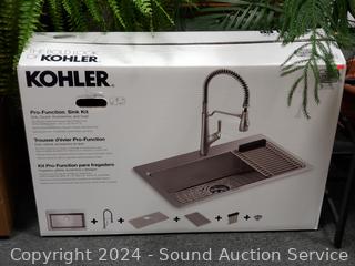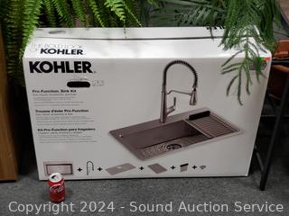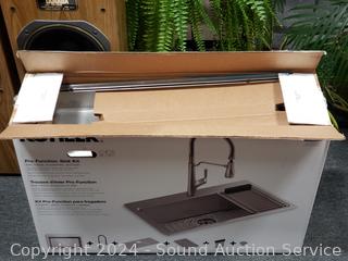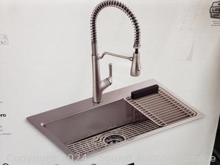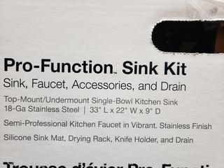 18GA Stainless steel sink 33" L x 22" W x 9" D, Semi-Professional Faucet, Silicone Sink Mat, Drying Rack, Knife Holder & Drain. Appears new, don't see any issues.