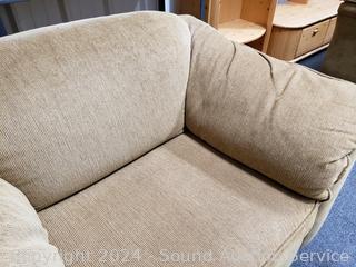 Approx. 32" H x 52" W x 18" to seat chair, 17" H x 22" x 40" ottoman. Matches the previous lot. Don't see any issues.