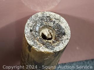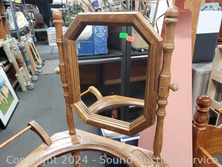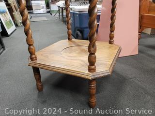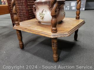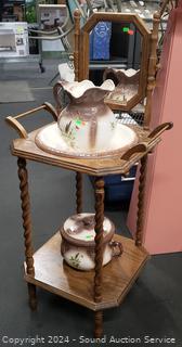 Barley twist supports, oak construction, some wear to finish, ceramic pitcher & basin. One foot is stripped. 47" H x 18" W x 18" D overall. 15" Dia basin. Refer to photos for more details.