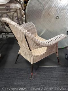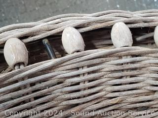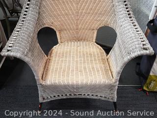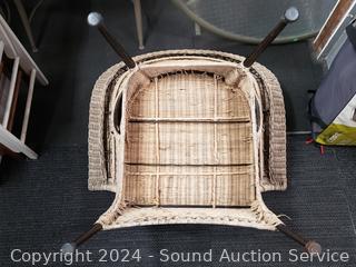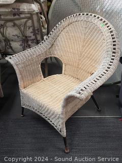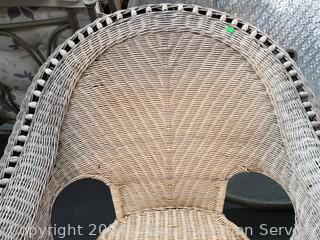 Various weathering discoloring, see a few minor breaks in wicker. 37" H x 35" W x 15" to seat.