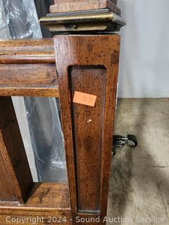 Finials on headboard are loose. Mattress is in good condition, kind of has a dingy tint from age. 48' H x 79" W headboard, 9" x 76" x 76" mattress.