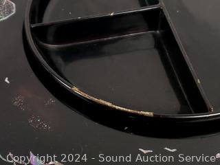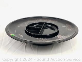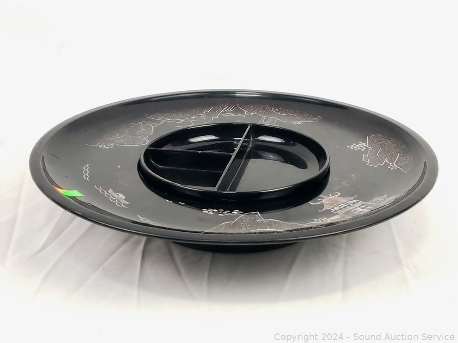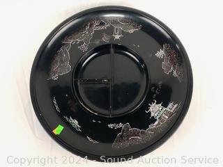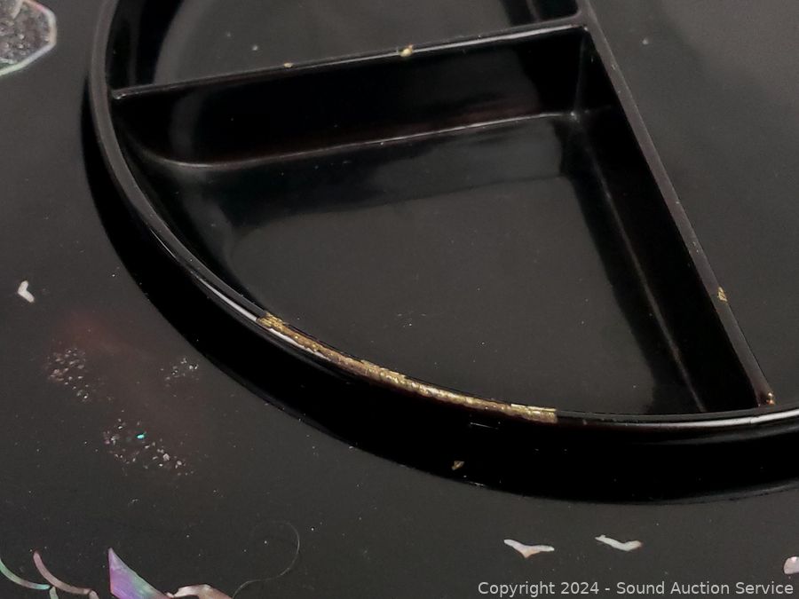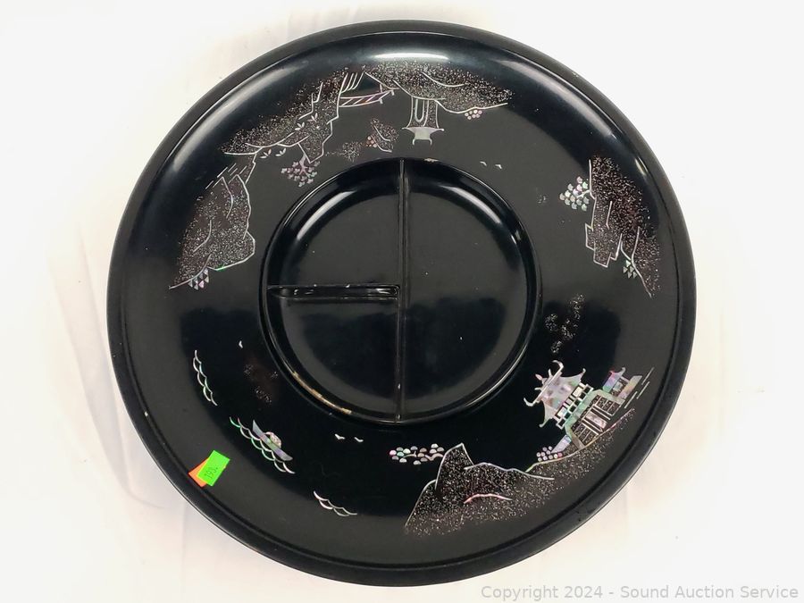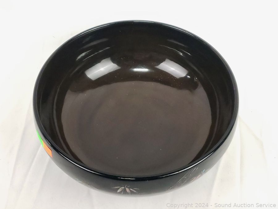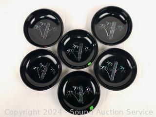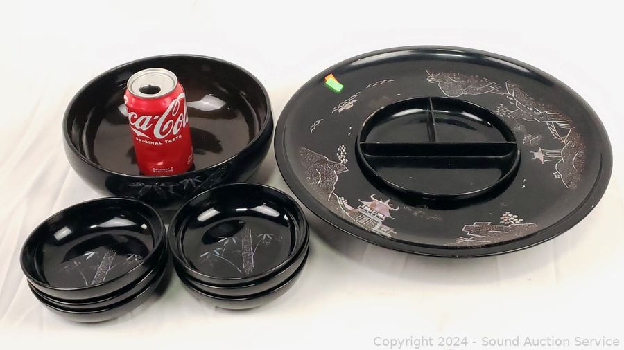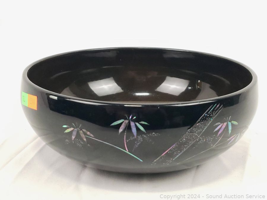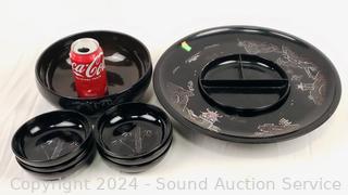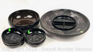 Believe glazed ceramic with MOP inlay. (6) 5.5" salad bowls, 9.25" salad bowl, 14.5" lazy susan appetizer server, some minor chipping.