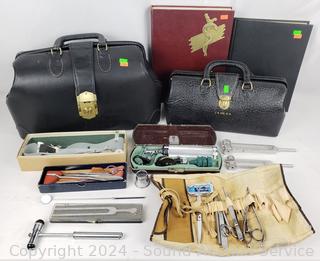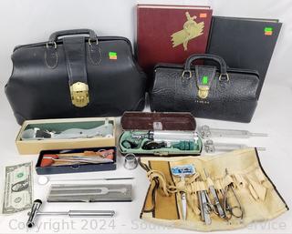 Lot #0112: 2 Vintage Doctors Bags w/Some Medical Tools & 1965-66 Kansas City College Yearbooks