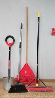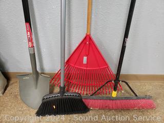 Spade shovel, leaf rake, household broom, 24" push broom.