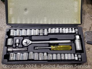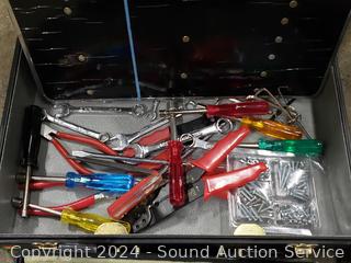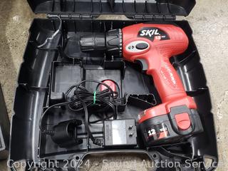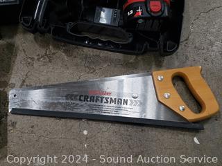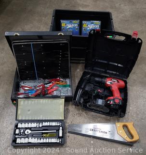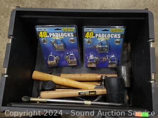 Skill 12v Drill w/Charger & Case. (2) 3pk of padlocks, 3 rubber mallets, hammer, Craftsman 15" crosscut saw, Brief tool case full of tools.