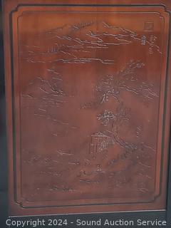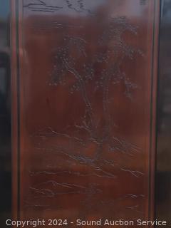 This is a nice piece, very will made, all wood construction, brass hardware, carved Asian scene throughout, beveled mirror inside the door, rack on one door, removable cubby shelving, cord holes & perforated cutout in the back, 4 shelves. In excellent condition, do see a few minor knicks dings along the bottom edge. Approx. 78.25" H x 44" W x 18.5" D.
