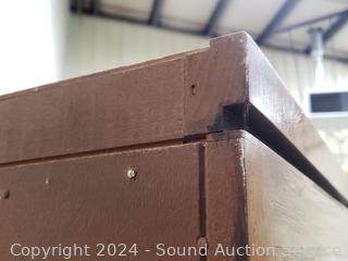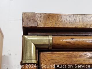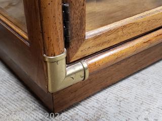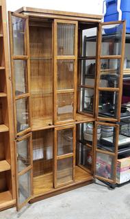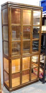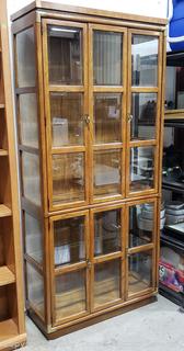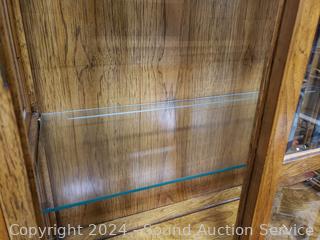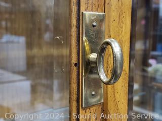 3 glass shelves with plate grooves, beveled glass in the doors, brass accent, hardware. Damage to the veneer on the top left corner. Has been repaired. 78.5" H x 36" W x 15" D.