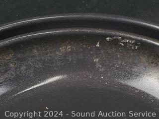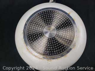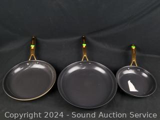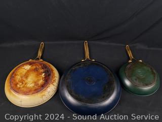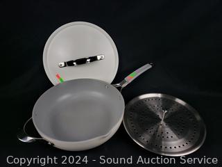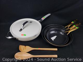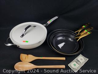 Tramontina 12" multi-purpose pan w/steamer insert, lid & 2 wooden spoons, in great condition. Greenpan 8", 10", 12" skillets heavy wear from use.