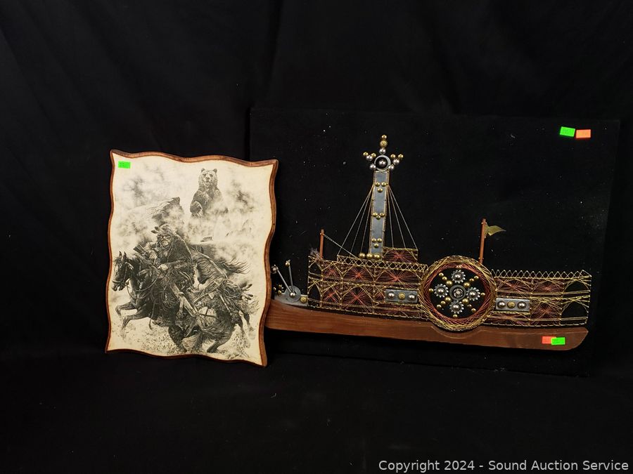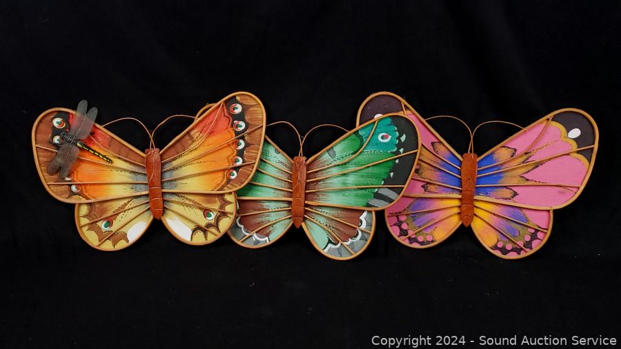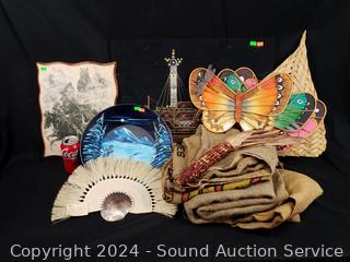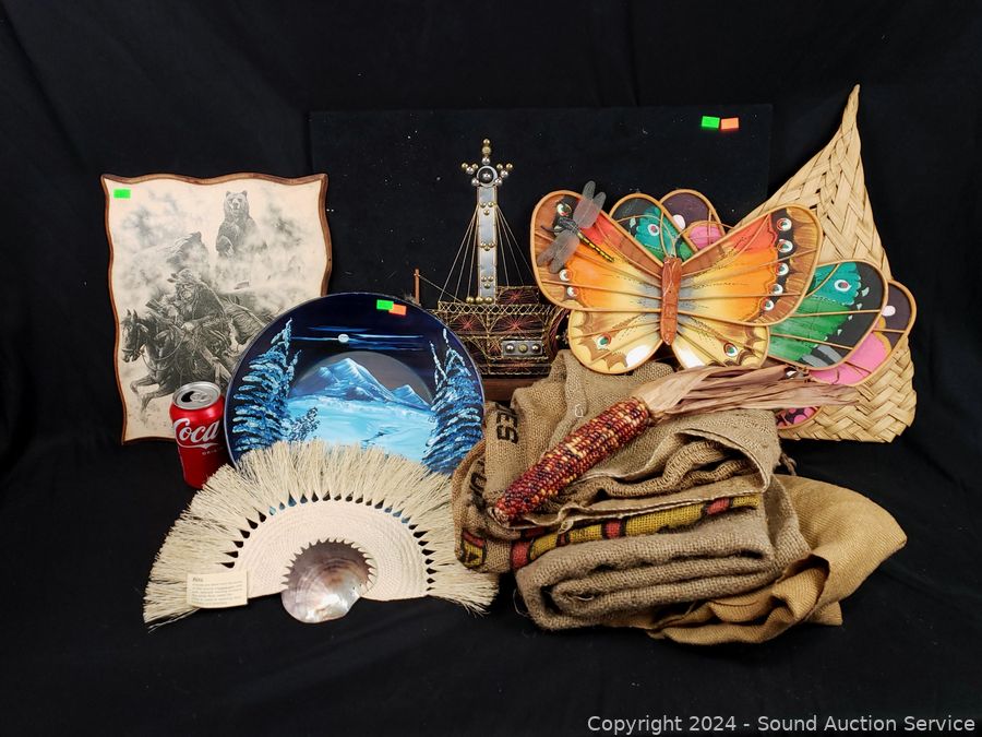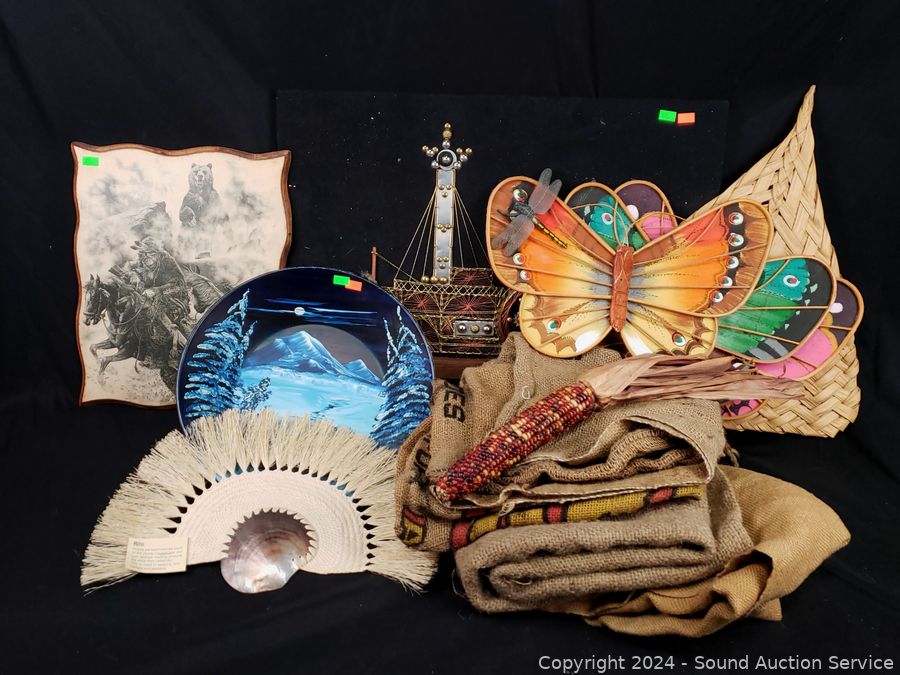 2 handcrafted fans, 3 hand painted crafted butterflies, hand painted Alaska gold pan, wire art ship, native plaque, etc. Refer to photos for more details.