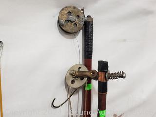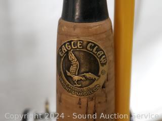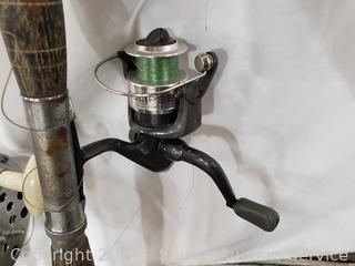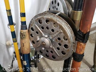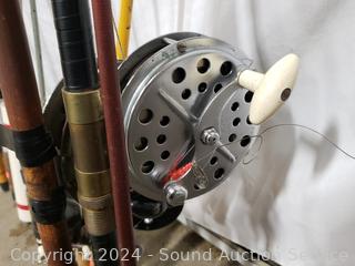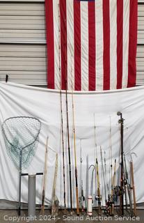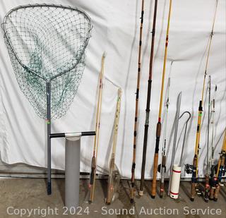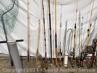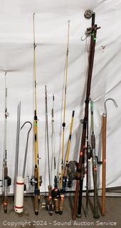 Lot #0154: Assorted Fishing Rods w/Reels, Gaff Hook, Landing Net, Clam Gun