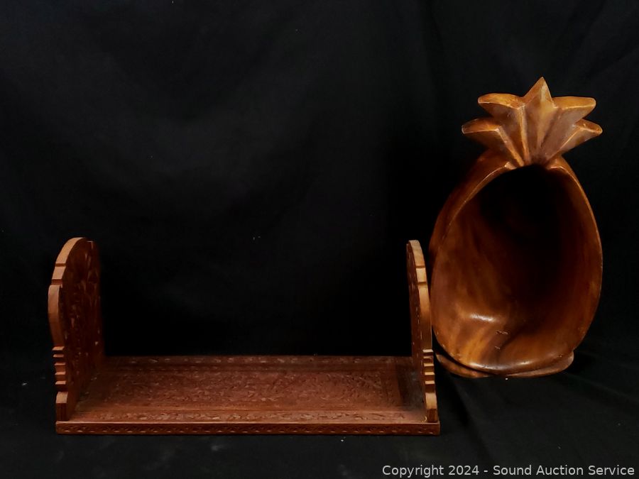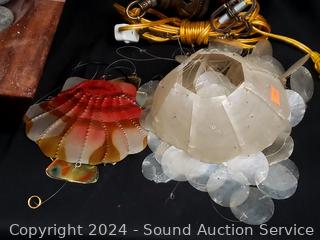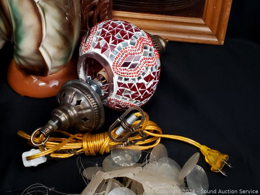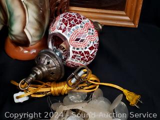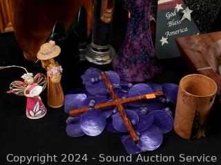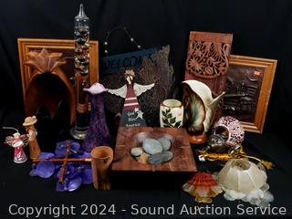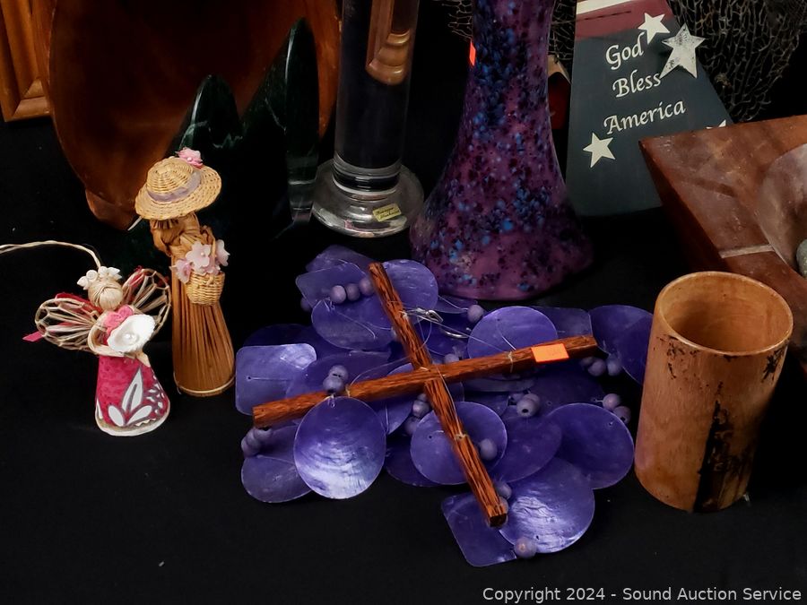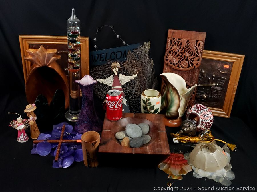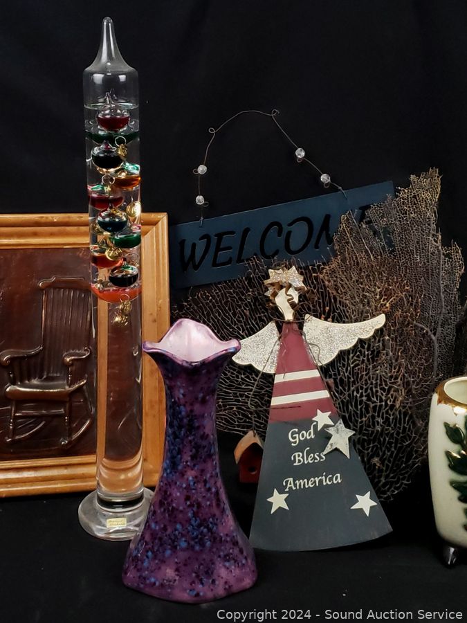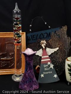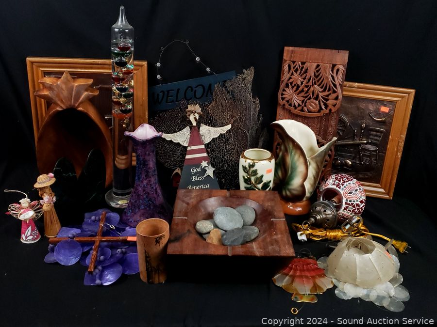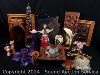 Galileo thermometer, hanging lamp, vases, wood bowl, wood shelf, etc. Refer to photos for lot contents, more details.