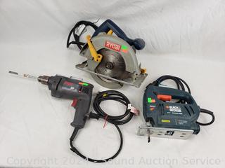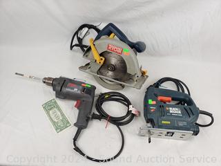 Lot #0352: Ryobi 7-1/4" Circular Saw, B&D Scroll Saw, Skil 3/8" Drill