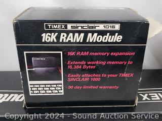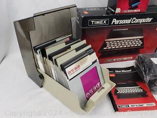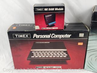 Timex Sinclair 100 Personal Computer, Timex Sinclair Printer 2040 w/Printer Label Rolls, Timex 16K RAM Module, Floppy Discs, User Manual. Untested. Comes with original boxes. Refer to photos for more details.