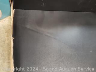 72" H x 48" x 24". 2 shelf boards are cracked, others have some damage to edges, corners. Frame is good, no plastic end caps.