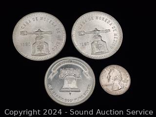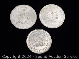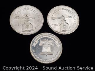 Lot #0060: (2) .925 Mexico & (1) .999 Liberty Silver Rounds
