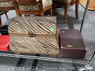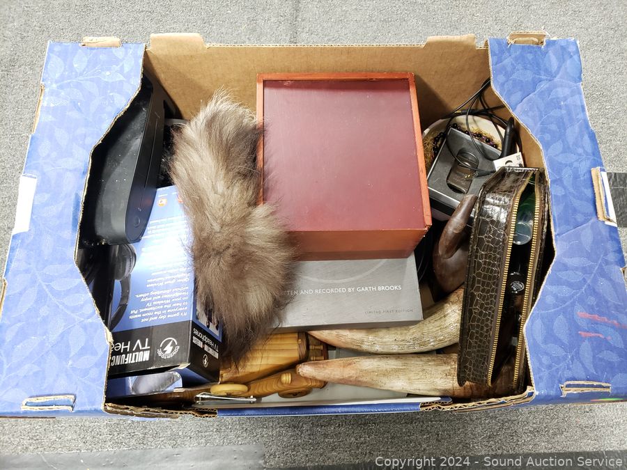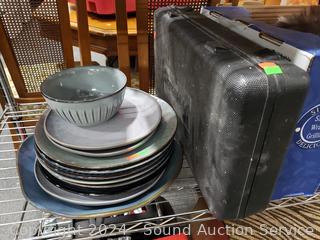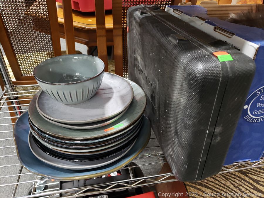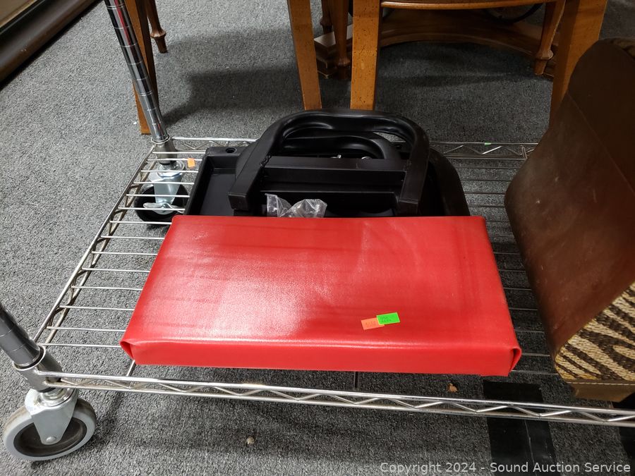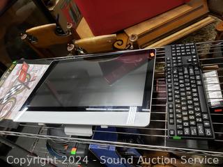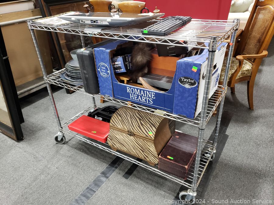 All in One PC (untested, no power supply, keyboard or mouse, I do not see a brand, model A220T), stoneware dishes, unassembled mechanics stool, USB keyboard w/extra-large font, wood car, wireless headphones, horns, decorative chest & more. Cart NOT included. ATTN: All items are used, may be missing pieces, damaged, not functioning, complete, no issues, etc. All items as is. Refer to photos for more details.