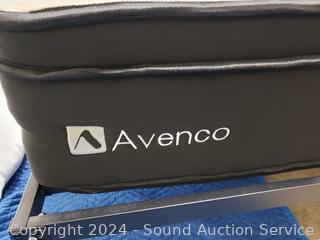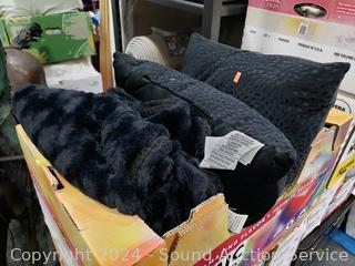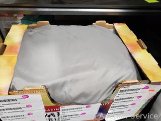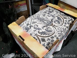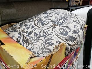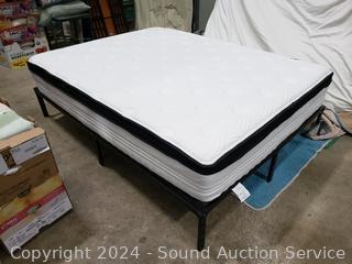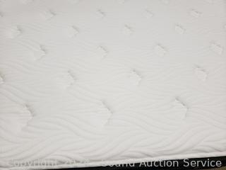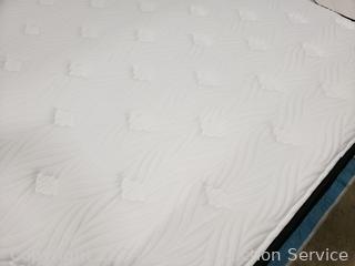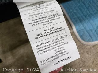Sweet Night pillowtop mattress, 11" x 60" x 78". 48" H x 115" W headboard. Matching nightstands 21.5" H x 26" W x 17" D. Complete set of bedding with matching throw pillows. Some dings, scuffs on edges of headboard.