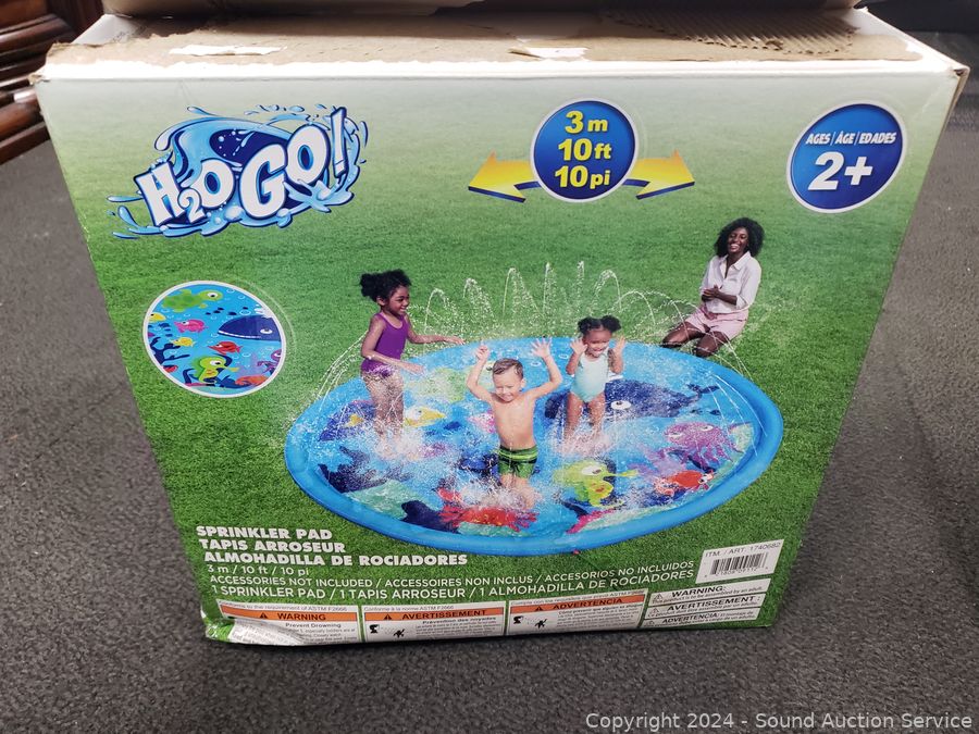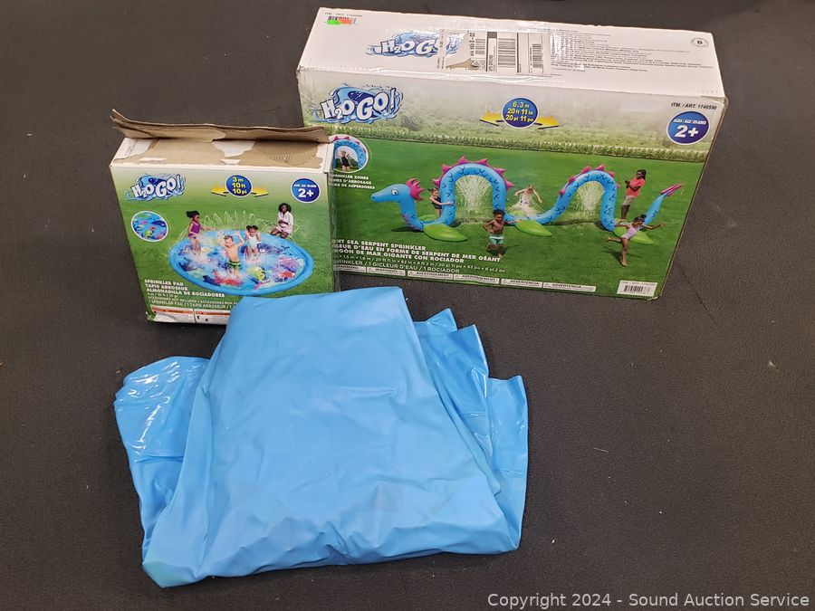 10ft sprinkler pad, various wear from use. Giant 20'11" x 6'2" x 62" Sea Serpent, factory sealed. Both untested.