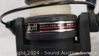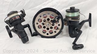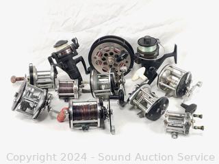 Penn 60, 923c True Temper, Garcia Ambassadeur 10000C, JC Higgins 3137, Pflueger Capitol 1985, South Bend 560, Bronson Lashless Model 1700, Penn 209 Reel, Pfleuger Sal-Trout 1558, Zebco PSG20, Master Graphite 651. All with signs of wear from use.