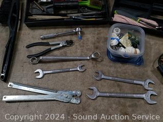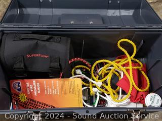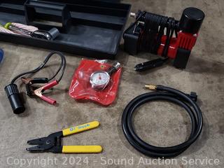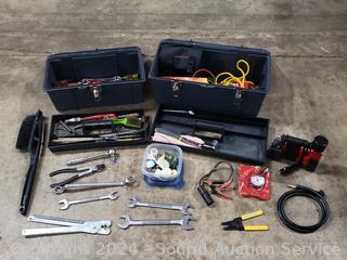 12V tire pump, gauge, hand tools, wrenches, etc. Refer to photos for lot contents, more details.