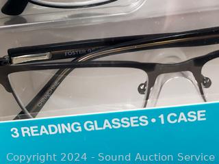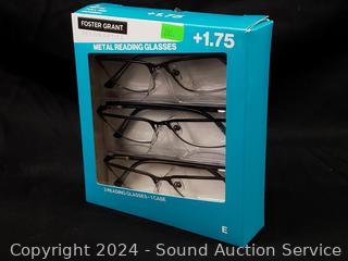 Lot #0265: 3 Foster Grant Metal +1.75 Reading Glasses w/1 Case
