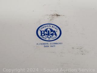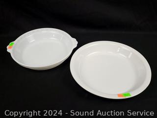 All but pie pans have lids, 1 lid is chipped. 2 Pie pans, 1.5L dish, 1qt, 1.5qt, 2x10x10" pan. Refer to photos for more details.